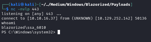 This new shell from the PowerShell payload kept crashing so I moved another reverse shell generated with msfvenom onto to get another shell back to my Kali machine. After this I uploaded mimkatz and used lsadump::dcsync /domain:blazorized.htb /all. This gave the Admin hash: