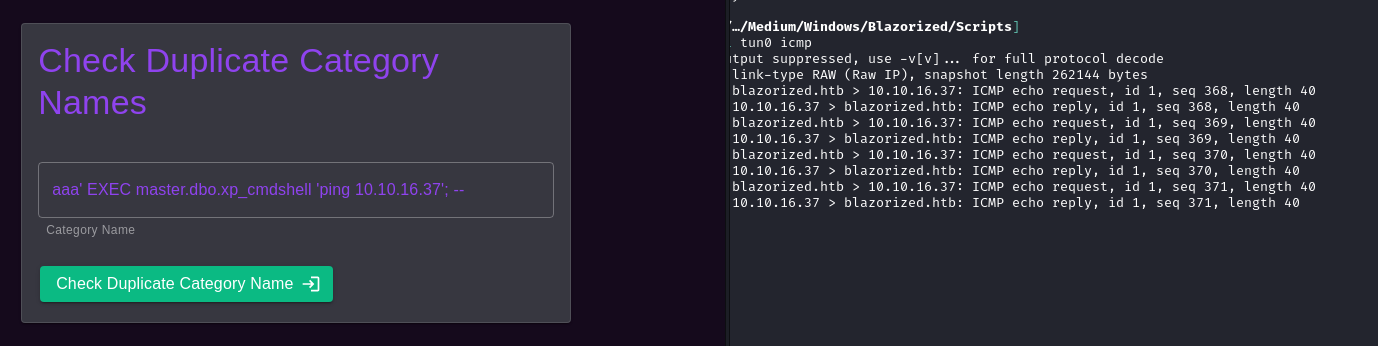 We can see that xp_cmdshell is enabled on the box with a ping payload and use tcpdump to watch tun0 for ICMP traffic:
